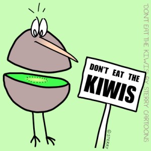 Funny cartoon featuring a worried kiwi bird standing next to a sign that reads “Don’t Eat The Kiwis”!