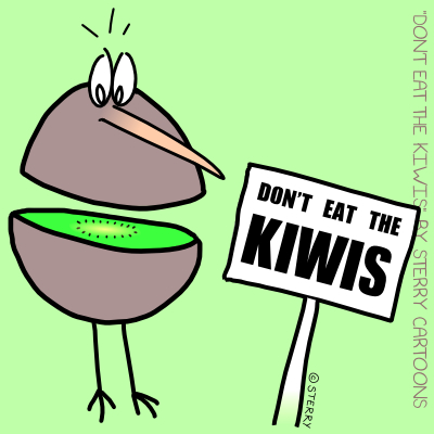 Funny cartoon featuring a worried kiwi bird standing next to a sign that reads “Don’t Eat The Kiwis”!